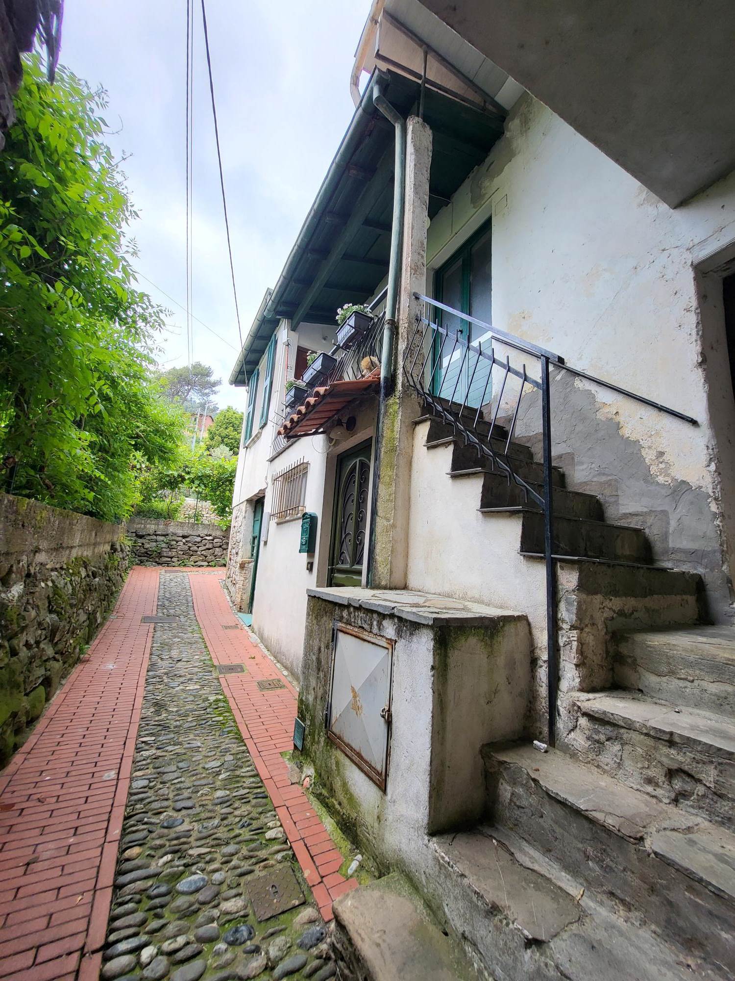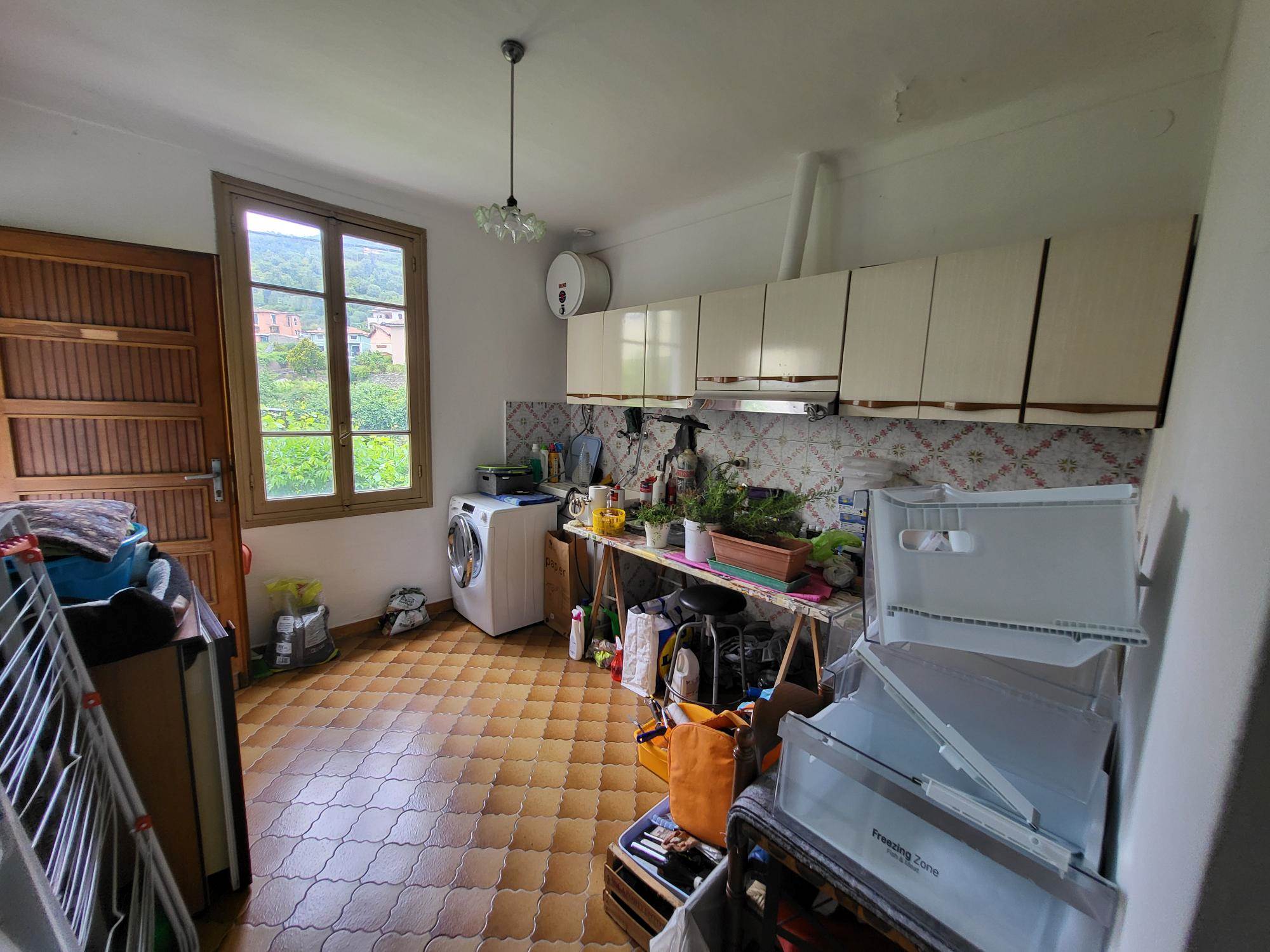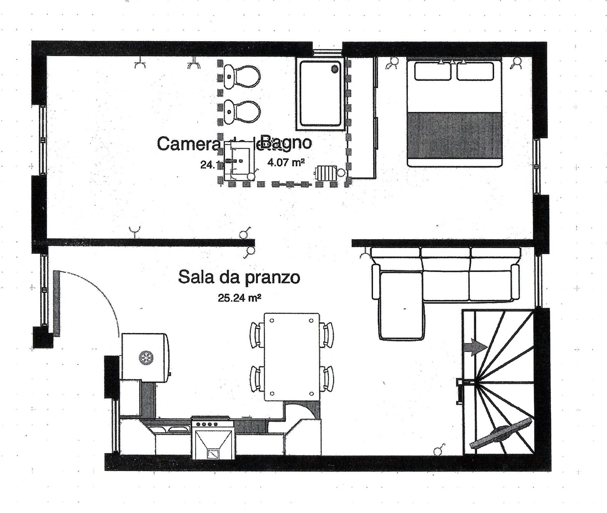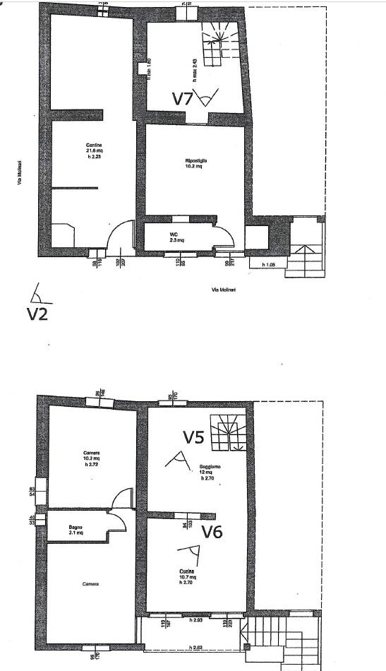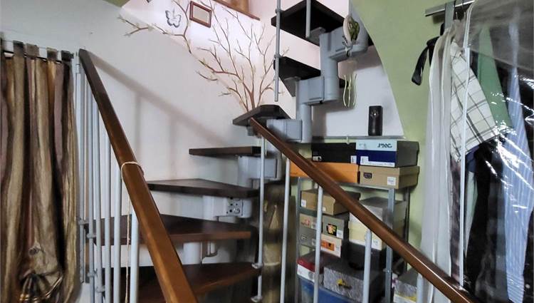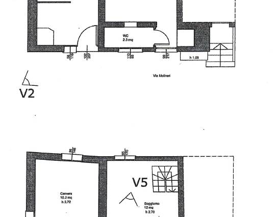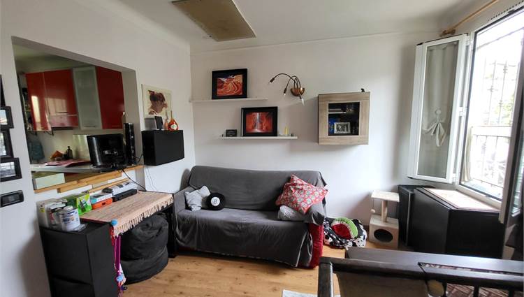 Attualmente la proprietà è composta da un bilocale con ingresso al 1° piano con un soggiorno e cucina e una camera con bagno e cabina armadi al piano terra con un altro bilocale da ristrutturare e unire al bilocale esistente e una grande cantina/tavernetta.